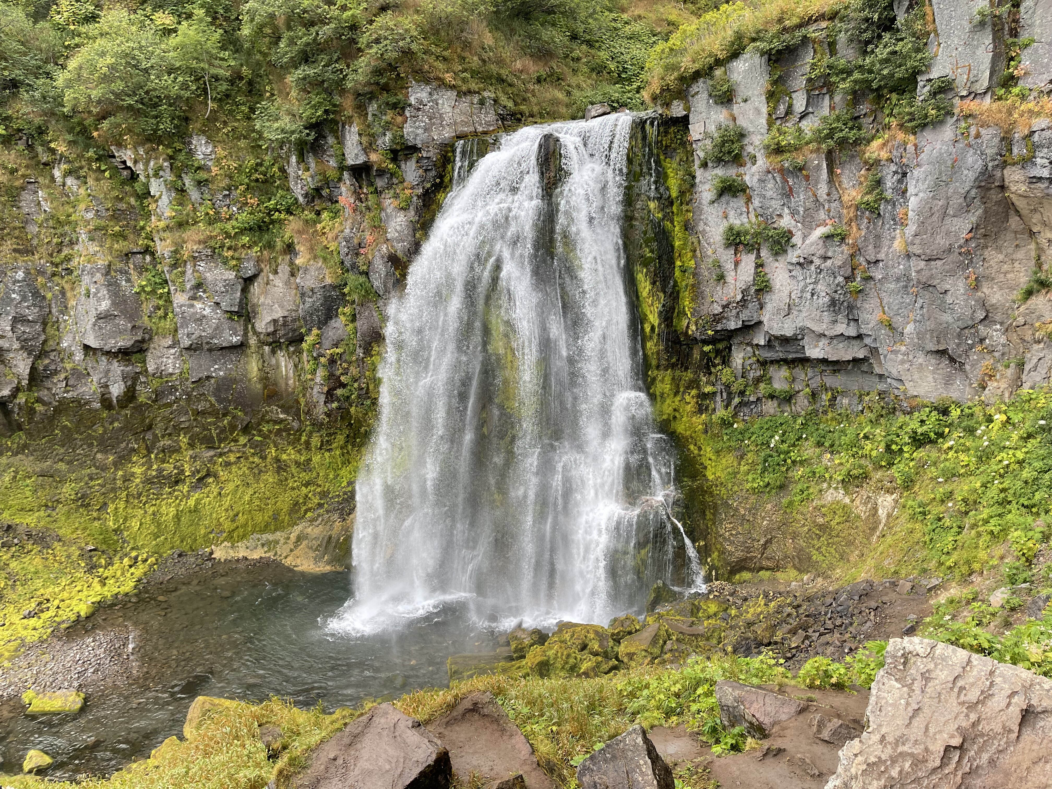 После обеда едем к Медвежьему водопаду. Высота падения воды около 80 метров, вокруг узкое ущелье с отвесными базальтовыми стенами из застывшей лавы.