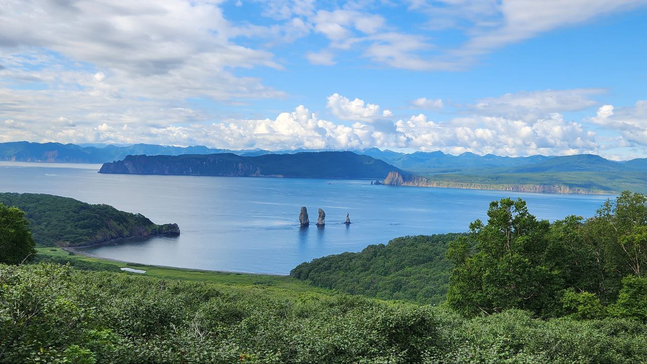 Первую остановку мы сделаем у уже известной достопримечательности Камчатки скал Три Брата, каменных столбов у входа в бухту, овеянных легендами коренных жителей