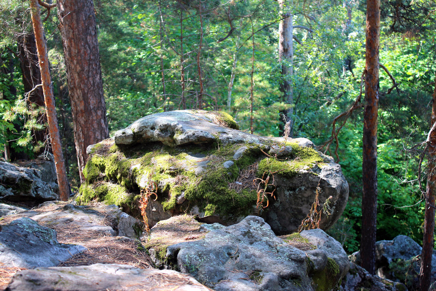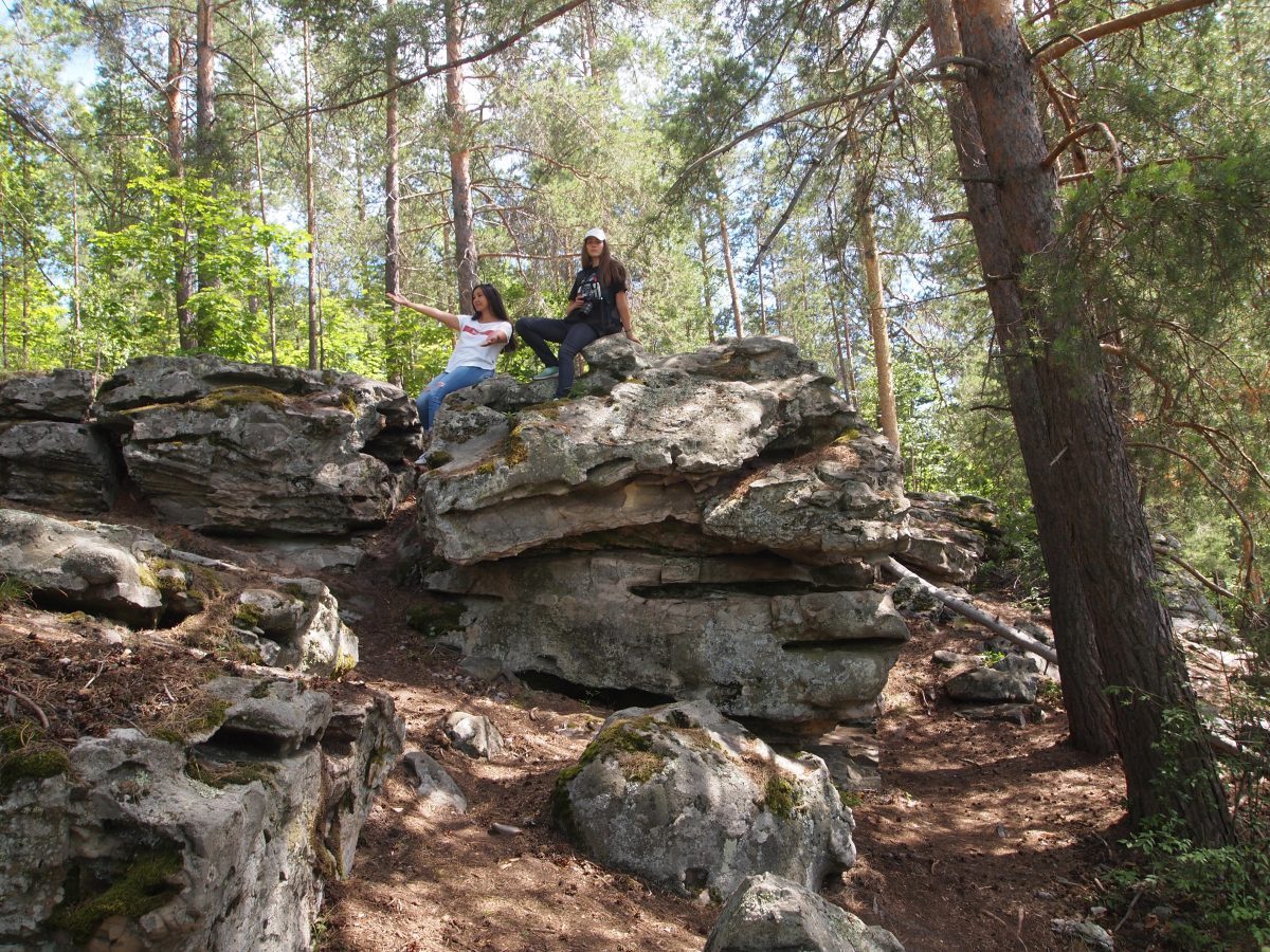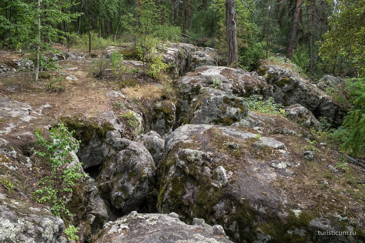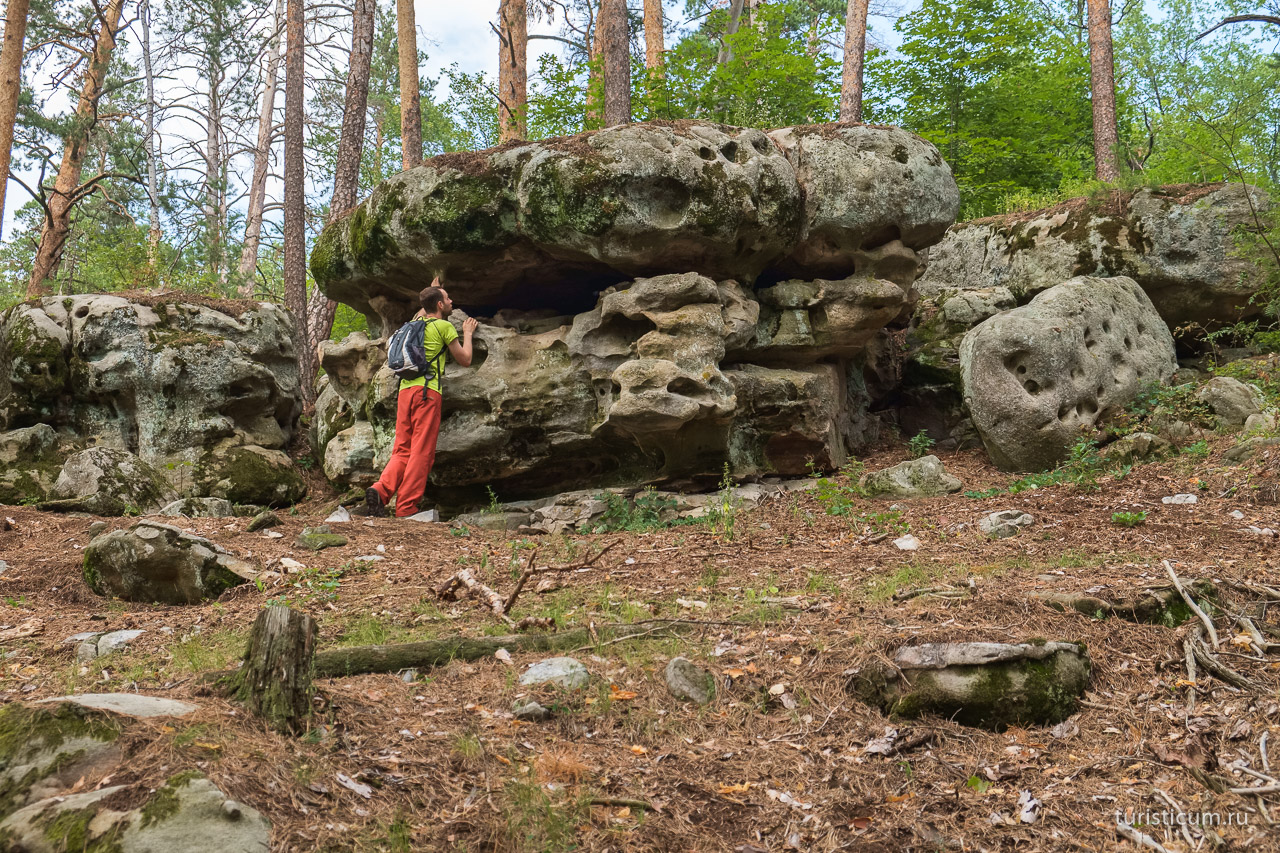 10.30 Спускаемся к истоку реки Усы, переход по мосткам и вот оно! Гремячинске высоты! Местами сосны растут прямо из камней. Огромные камни, валуны очень причудливой формы. Посещаем самые известные и яркие (Кобра, Грот Черепашка). Наслаждаемся природой, фотографируемся. Изучаем.